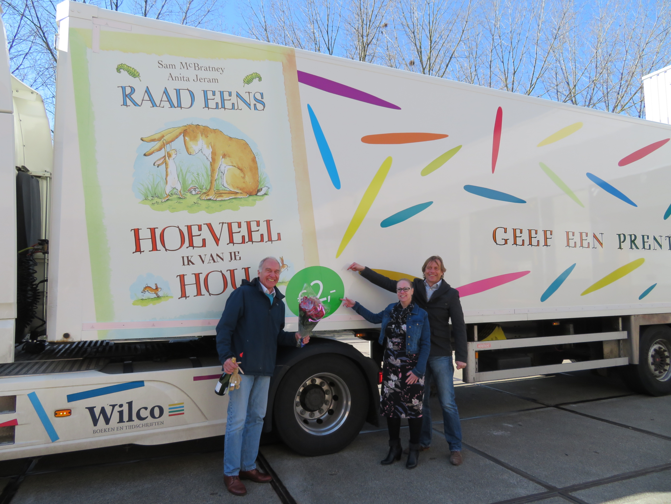 Wilco directeur Robbert-Jan de Rooij reed zelf met zijn vrachtwagen samen met uitgever Jean Christophe Boele van Hensbroek van Lemniscaat naar CB om de eerste exemplaren af te leveren.
