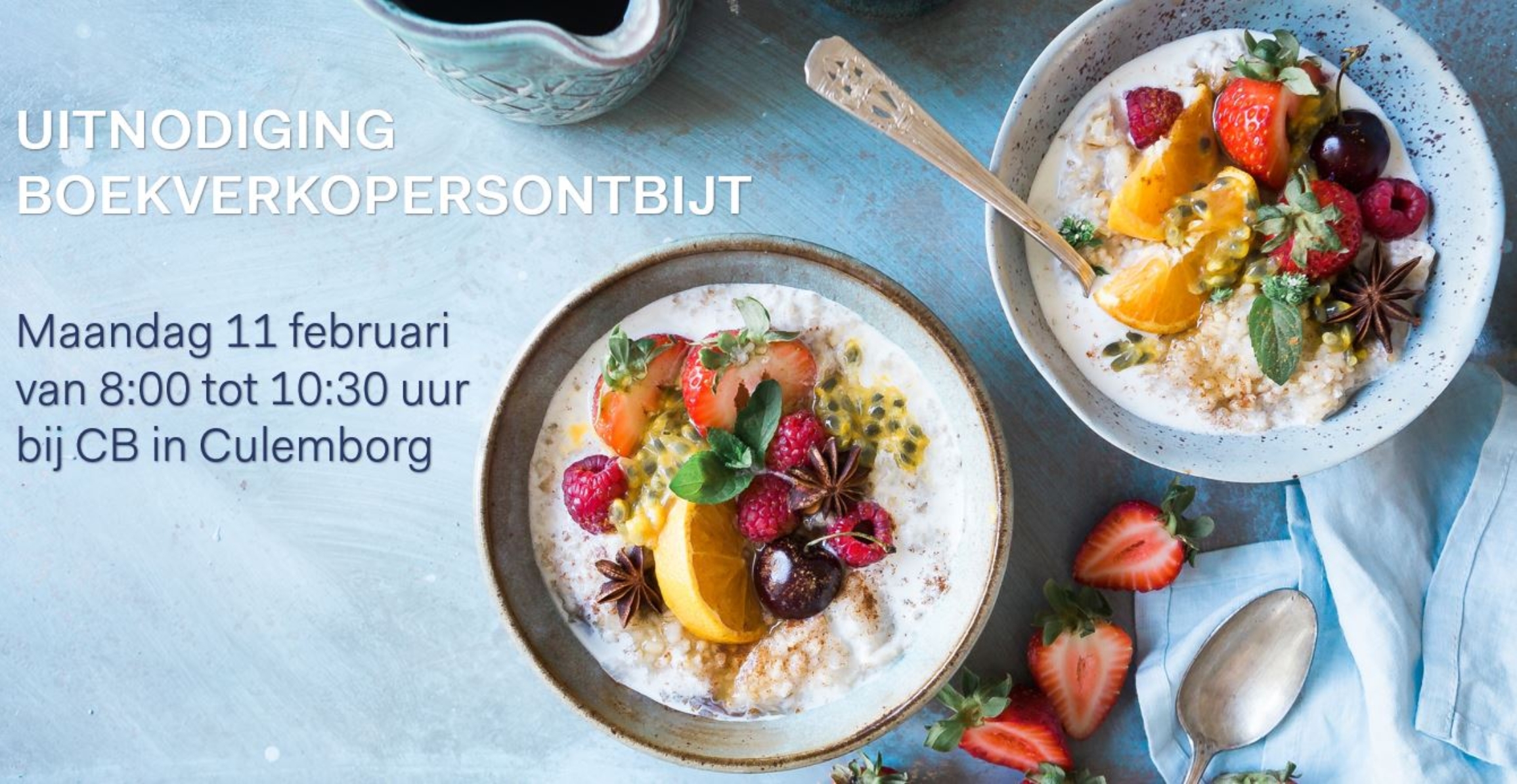 Inspiratie en ontbijt! Bent u erbij boekverkoper? Op 11 februari bent u van harte welkom aan de ontbijttafel in Culemborg. Naast een lekkere en gezonde start van de dag bieden wij u een interactieve en inspirerende ochtend.